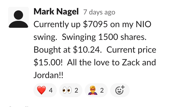 My proven strategies work on both timeframes. I prefer day trading, but it works just as well for swing trading. We also have a swing trading channel in the room where I give you a weekly watchlist of all the stocks I'm watching for the week and where I'm looking to enter/exit.