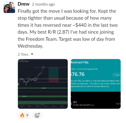 “I joined the Freedom Team with three goals in mind. One, to learn a proven, back tested strategy that would provide the foundation for success in my trading. Two, to be able to read charts and understand why they move the way they move. Three, ideally, be able to recoup the cost of the course by the end of the 8 week program. After about 9 weeks, I am ecstatic to be able to say that all my goals were accomplished and I learned so much more beyond that! Biggest trade of my career resulted in $22/share profit and it wouldn't have been possible without the Freedom Team's knowledge. Working with Coach Zack, he held me accountable and challenged me to improve each week. I had to put the work in, but Zack was their to guide me to success! I cannot recommend the Freedom Team enough!"