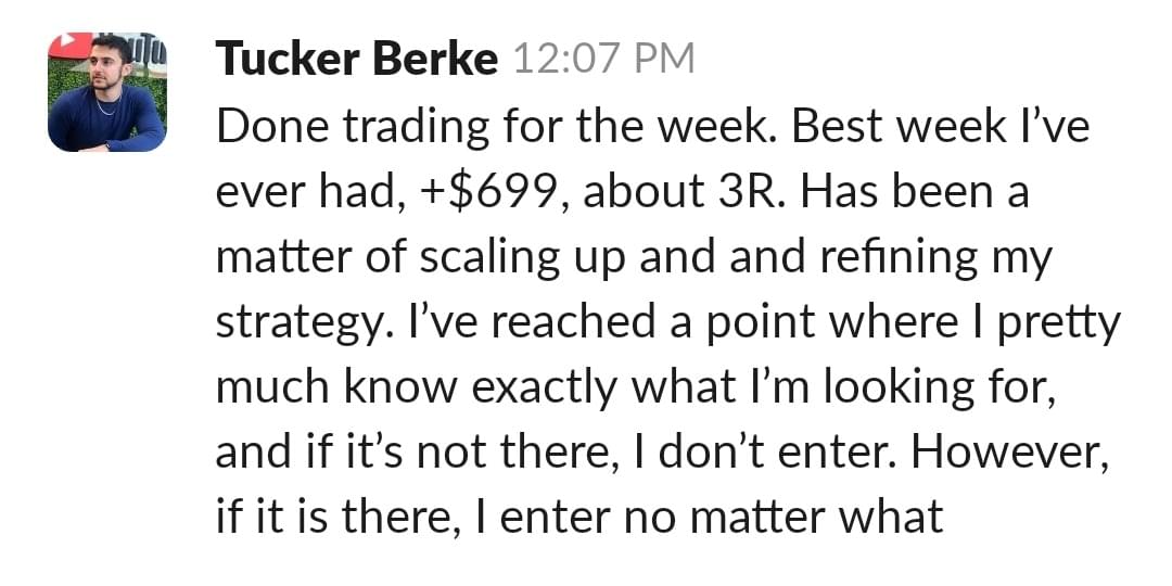 Since then, he learned how to place his trades, set alerts, get away from the computer and trust your strategy which is what brought him his best trading week so far.