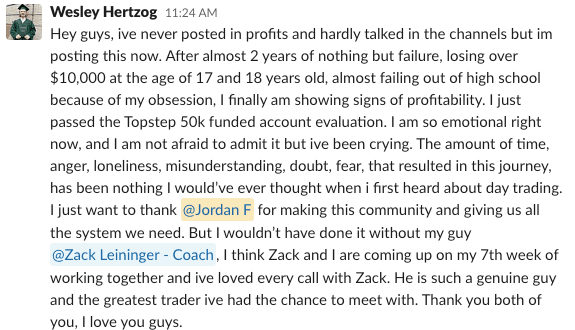 After almost 2 years of nothing but failure, losing over $10,000 at the age of 17 and 18 years old, almost failing out of high school because of my obsession, I finally am showing signs of profitability. I just passed the Topstep 50k funded account evaluation. I am so emotional right now, and I am not afraid to admit it but i've been crying. The amount of time, anger, loneliness, misunderstanding, doubt, fear, that resulted in this journey, has been nothing I would’ve ever thought when i first heard about day trading. I just want to thank Jordan for making this community and giving us all the system we need. But I wouldn’t have done it without my guy Zack. I think Zack and I are coming up on my 7th week of working together and i've loved every call with Zack. He is such a genuine guy and the greatest trader i've had the chance to meet with. Thank you both of you, I love you guys.